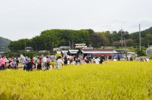 10月14日(土曜日)、東葛城小学校の東葛ふれあいファーム(河合町)で、地域の方やJA職員さんの協力のもと、稲刈り体験会が行われました。児童と一般応募の家族、約100人が参加し、「実りの秋」を体感しました。