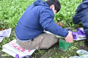 1月24日(水曜日)、春菊を収穫中の植田さんのハウス(阿間河滝町)にお邪魔しました。